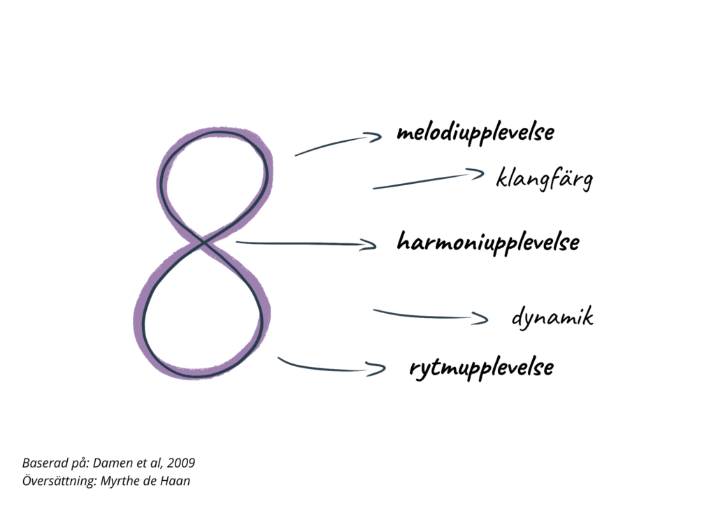 I schema kan musikens grundläggande treledningsstruktur framställas på följande sätt. Lemniskatan visar att de tre områdena genomtränger varandra. Pilarna visar att det musikaliska upplevandet utgår från mitten och sprider sig därifrån.