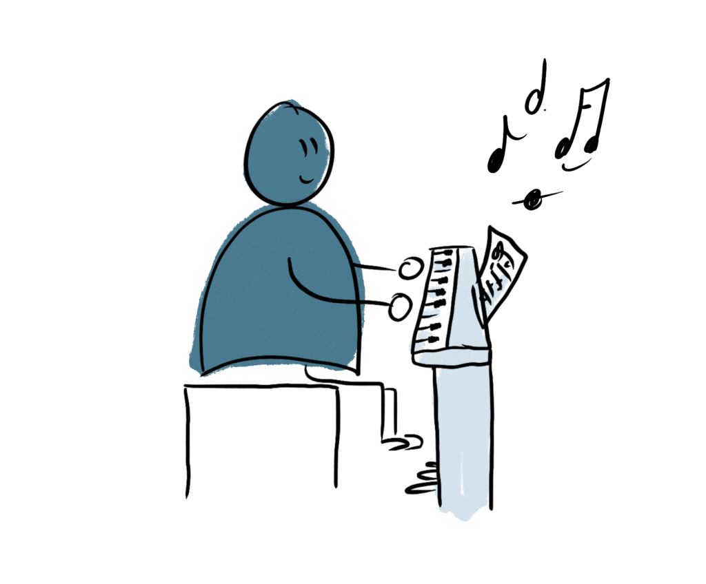 Als muziektherapeut ben ik opgeleid om me aan te passen aan de persoon die ik help, en dat geldt ook voor mijn pianolessen. Als je snel denkt, focussen we misschien meer op muzikale expressie en techniek dan op theorie. Vind je theorie juist wat lastiger, dan nemen we rustig de tijd en oefenen we wat meer samen.